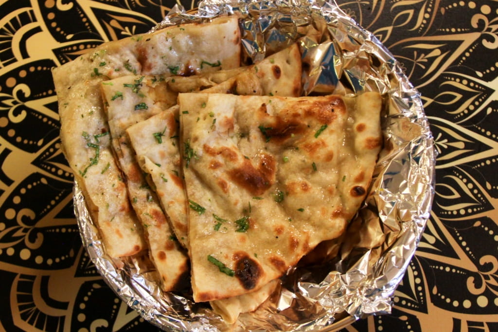 Podpłomyki nadziewane ziemniakami, cebulą i przyprawami, pieczone w piecu tandoor