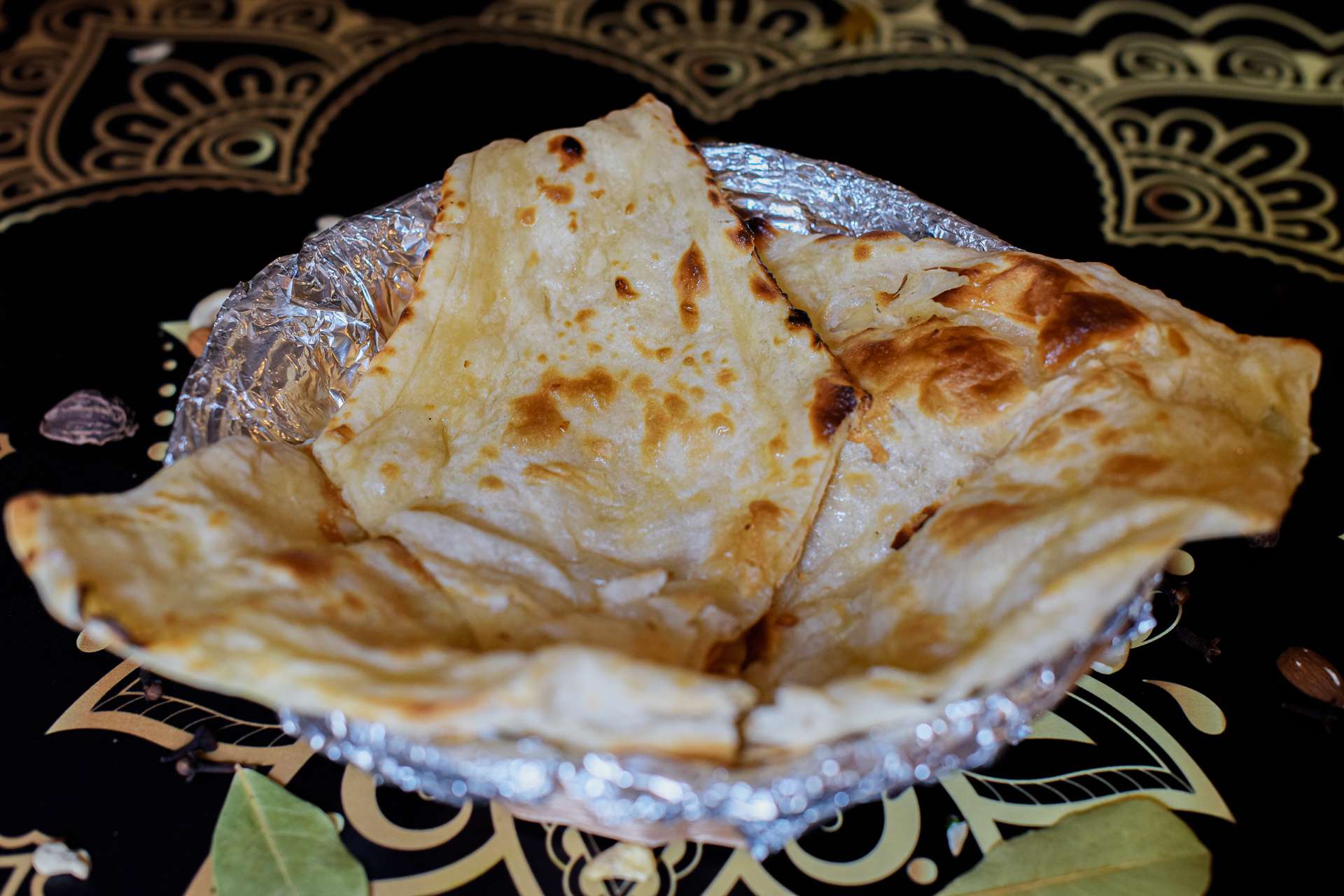 Podpłomyki z mąki pszennej, pieczone w piecu tandoor, posmarowane masłem